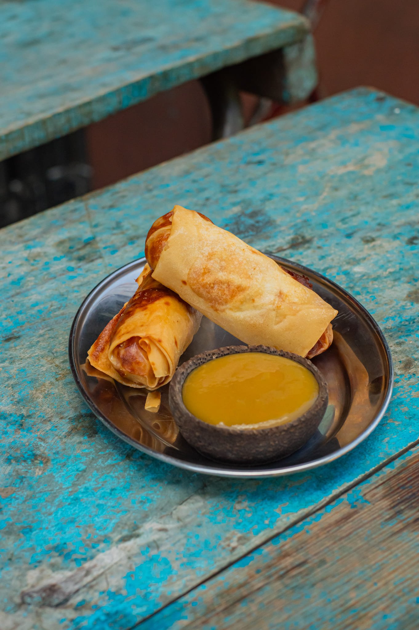 Nem garni d’un poulet au curry thaï. À tremper dans un coulis de mangue