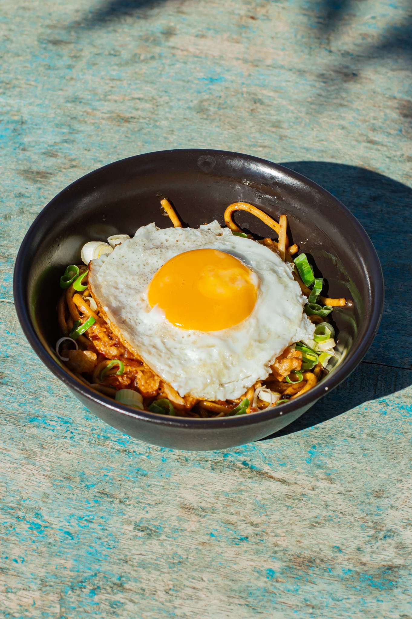 Nouilles sautées dans une sauce sucrée salée, accompagné d’un oeuf au plat, petits légumes, cébette et oignons frits