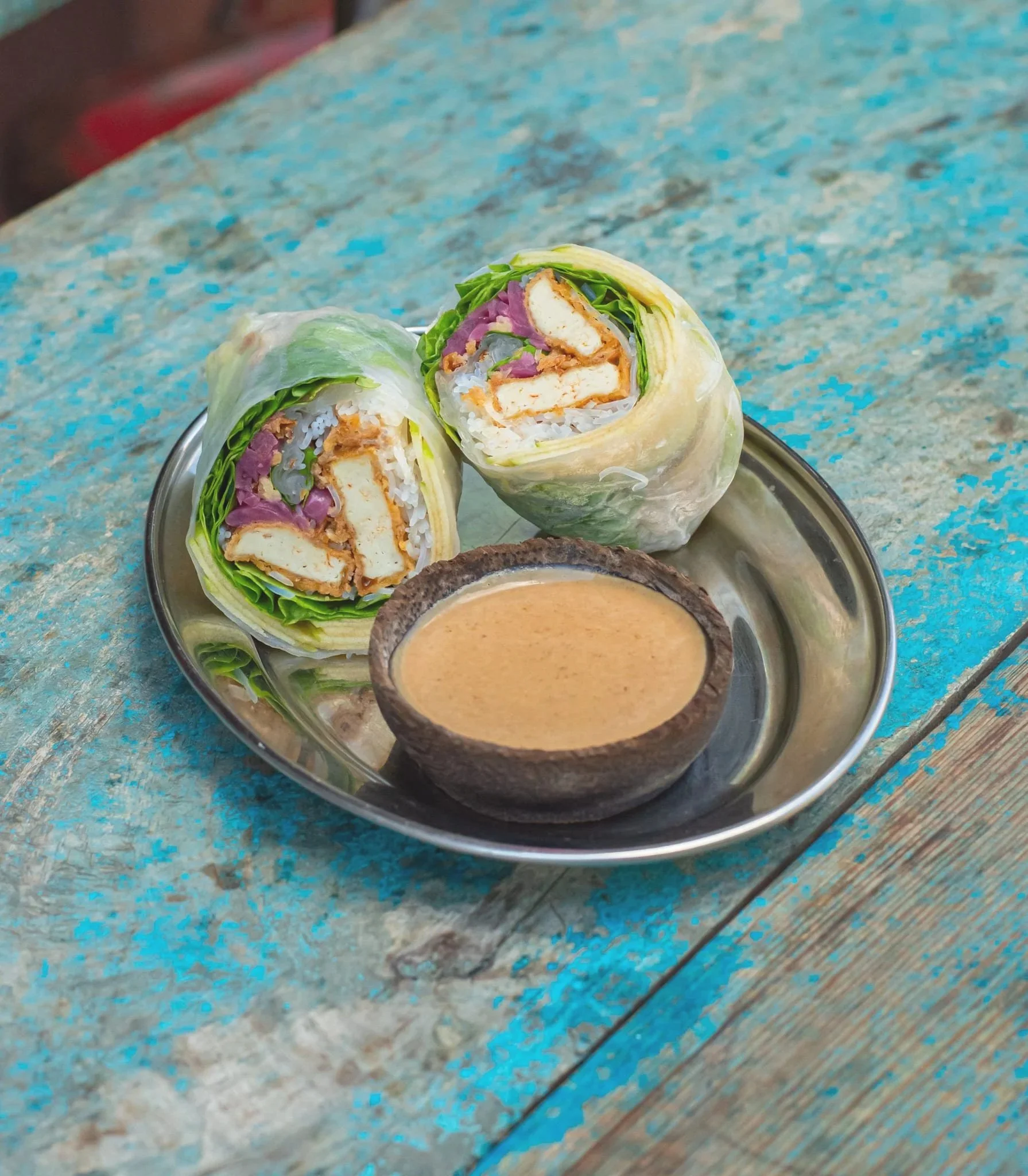 Rouleaux de printemps poulet curry thaï, pomme granny, oignons rouges, oignons frits, chou rouge, basilic frais, sauce cachuètes