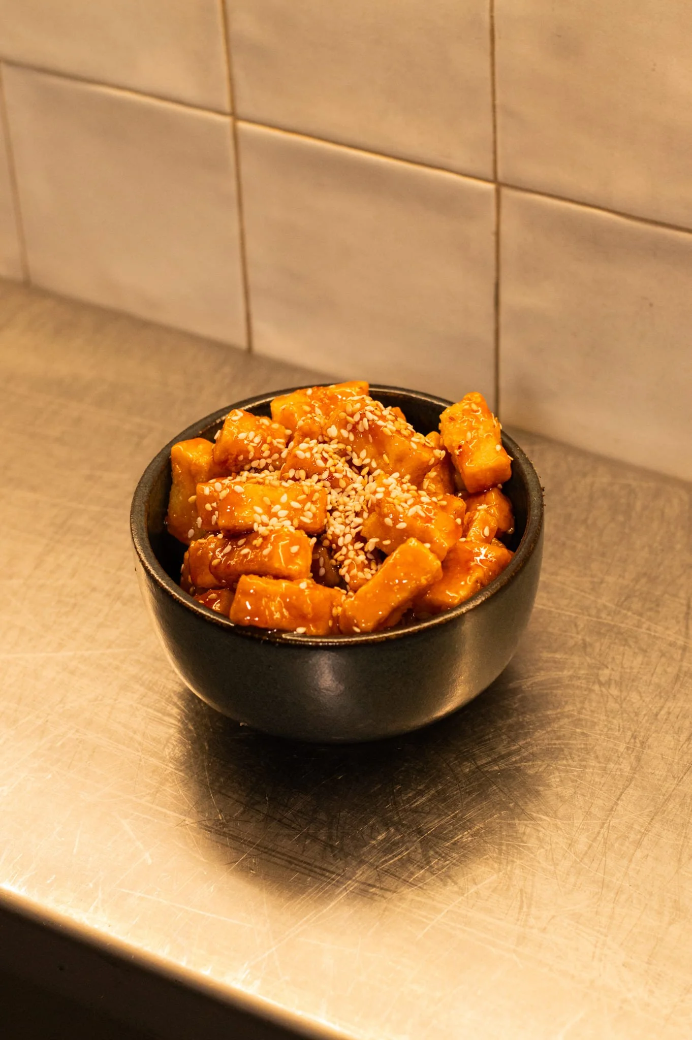 Dés de tofu frits, caramélisés dans une sauce gochujang légèrement épicée