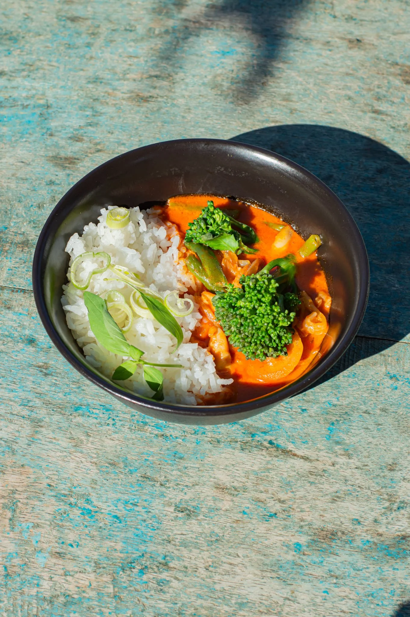 Curry de poulet légèrement épicé, accompagnés de légumes de saison et riz jasmin