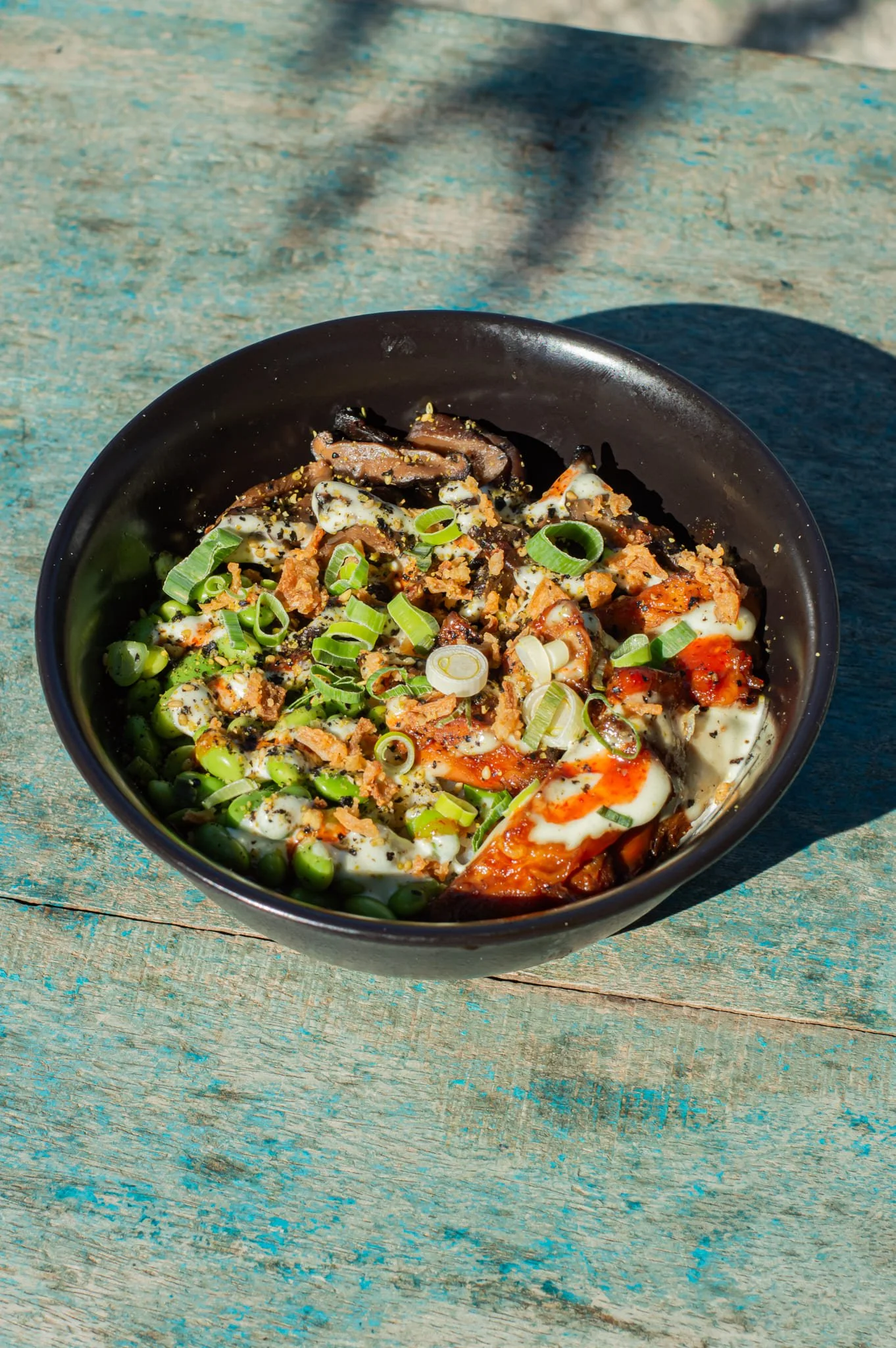 Riz vinaigré, accompagné de poulet BBQ Terriyaki (tofu caramélisé au Terriyaki en version 🌱), Shiitake, Wakame, Furikake & oignons frits.