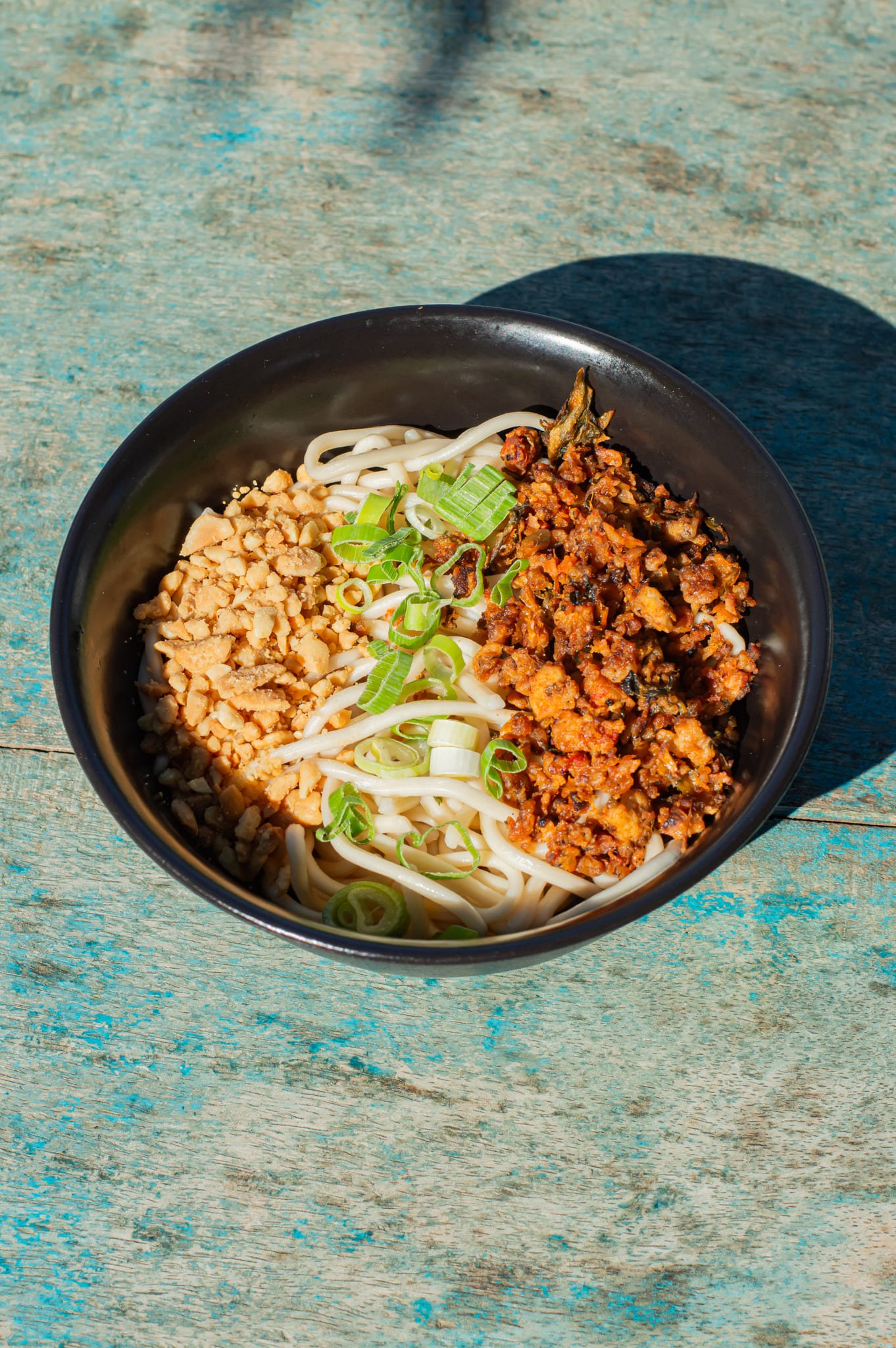 Nouilles épaisses, porc haché (ou tofu travaillé comme une viande hachée en version 🌱), sauce épicée au sésame, et cacahuètes grillées