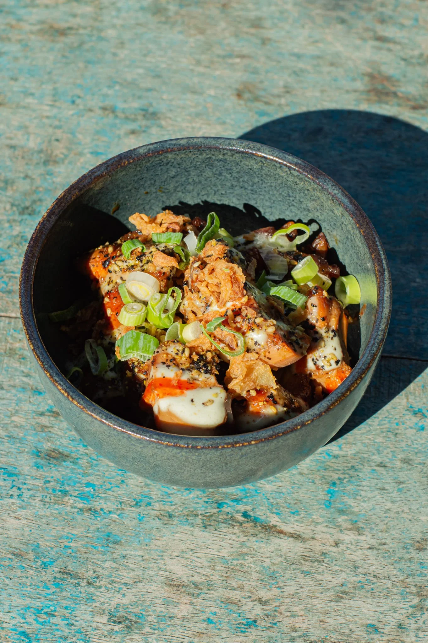 Tofu caramélisé aux épices satay, pickles d'oignons rouges, pomme granny, spicy mayo, oignons frits, coriandre, sauce cacahuète